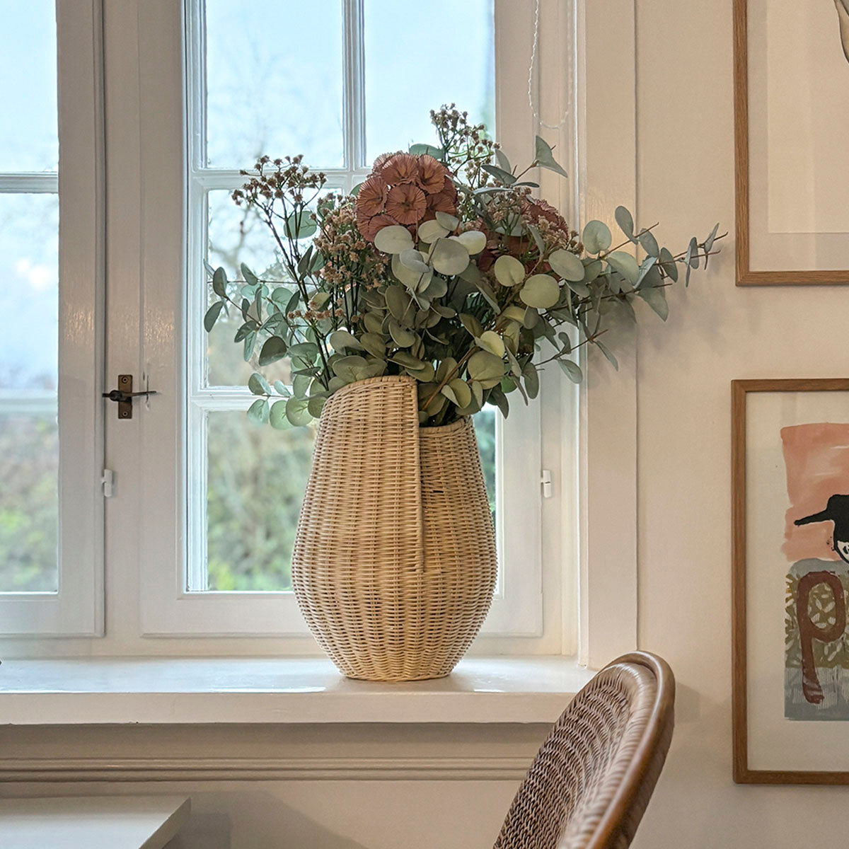 Aura is a beautiful asymmetrical basket, well-suited for dried or artificial flowers. The basket is handwoven from natural rattan, so small variations in colour and shape may occur.