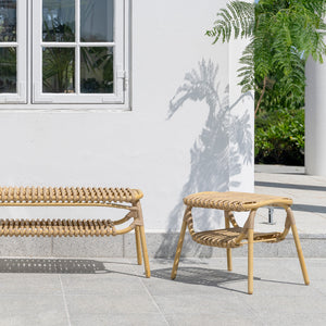 Our Machiya Exterior stool is handcrafted in Alu-Rattan and ArtFibre, and therefore has a unique strength and durability. Alu-Rattan is weather-resistant powder-coated aluminum and ArtFibre is artificial fibers made from polyethylene. Due to the weather-resistant materials the stool can stand outside all year round, without affecting the design or durability. The Machiya Exterior stool is also available in an indoor version made of rattan, see it here.