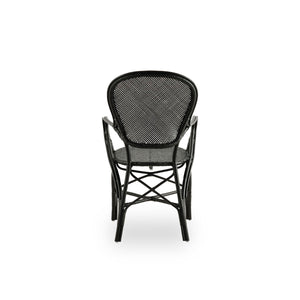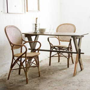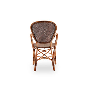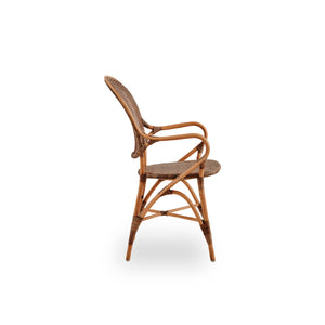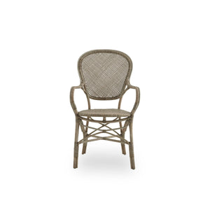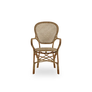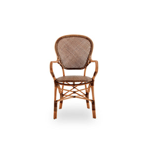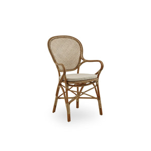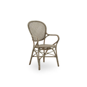 The chair is handcrafted in rattan, and is recommended for use indoor and covered areas outdoor. If rattan is exposed to rain, it will turn grey and affect the durability.